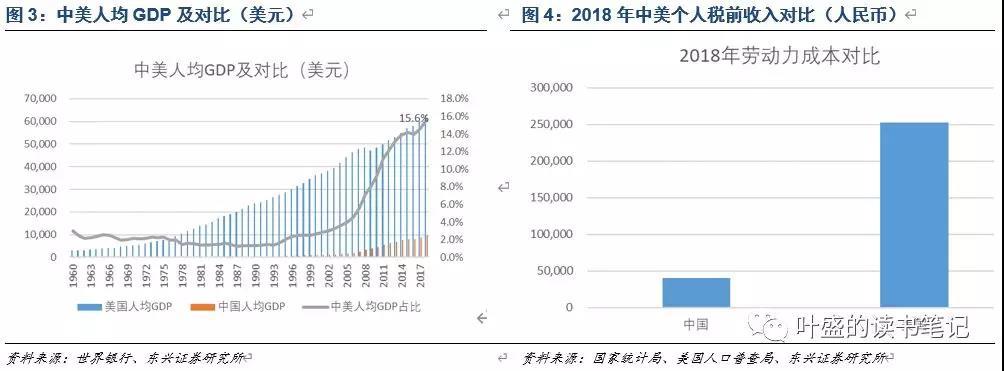 2、 2018年中国劳动力成本约是美国的15%。根据美国商务部普查局数据,2018年美国人均年收入为税前36080美元,占美国人均GDP的57%。