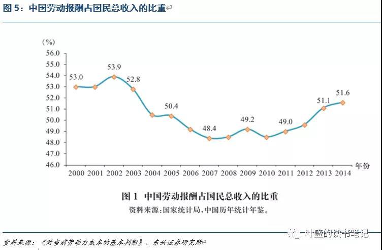 在这个粗放式发展过程中,鲜明的特征就是劳动报酬比例长期过低,劳动力收益要低于全社会平均收益水平。中国也是如此,根据国家统计局数据,从2000年到2010年,劳动力报酬占国民总收入的比重一直处于下降通道,期间占比从53%下降到47%。