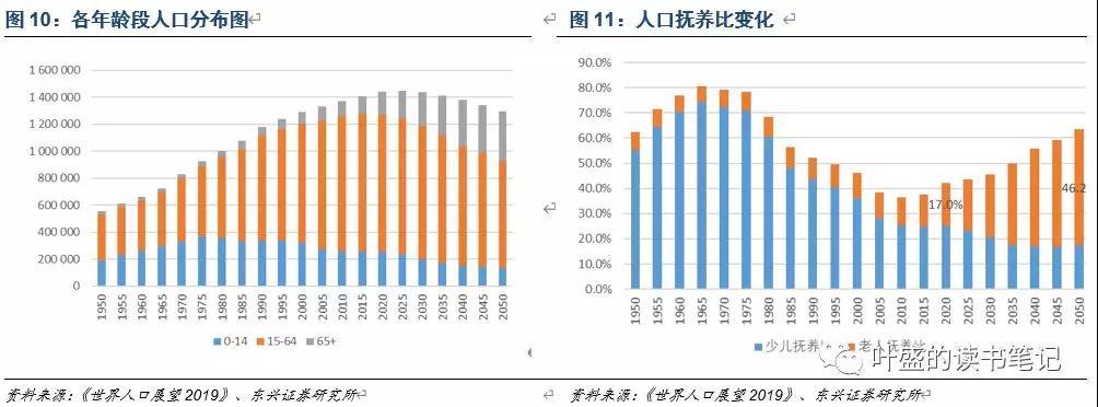 按照联合国《世界人口展望2019》里的低方案预测:从2020年到2050年,中国劳动人口和非劳动人口将分别由10.1亿、4.3亿变为7.9亿、5亿。也就是说由10个人养4.3个人,变成了7.9个人养5个人。在这期间,中国人口抚养比将由42%上升到64%,其中老人抚养比将从17%上升到46%。