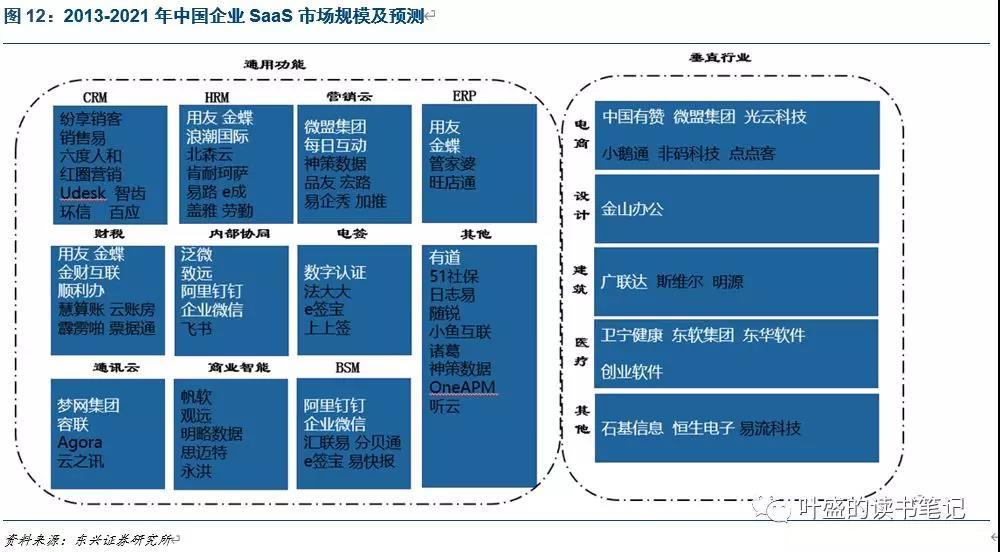 SaaS行业细分赛道众多,我们将主要赛道的一些龙头公司列出来如下图所示。我们把整个企业SaaS市场划为为两大块,通用功能和垂直行业。