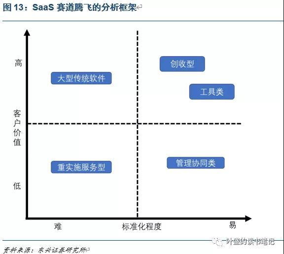 2、另一个维度是标准化难易程度;越容易标准化的SaaS排序越靠前;