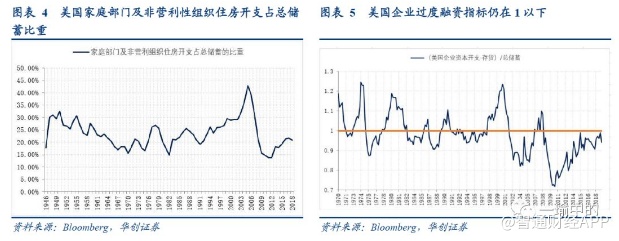对于家庭而言,无论是债务总量指标还是债务流量指标都是整体健康的。以美国家庭负债比率衡量的债务总量杠杆与以利息支出占可支配收入比重衡量的债务流量指标皆是过去四十年的绝对低位,同时家庭部门对于房地产相关的开支也控制在总储蓄的五十年平均比例水平,而这些指标在2008年都是极度失控的。