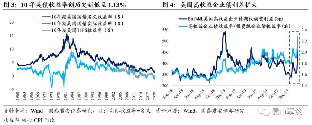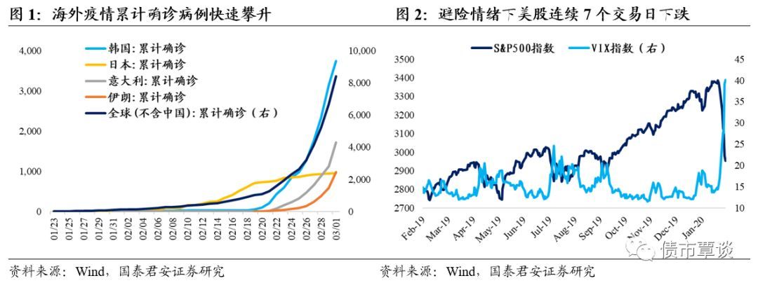 避险情绪持续发酵。截止到上周五2月28日,S&P 500指数连续7个交易日下跌,跌幅为12.8%。此外,VIX指数从14.4%快速上升到40.1%,铜价和原油价格下跌。10年美债收益率持续下行(从年初至今下行79bp),创历史新低至1.13%,10年/3月期限利差倒挂至-14bp。美国高收益企业债信用利差扩大105bp,投资级信用利差扩大19bp。
