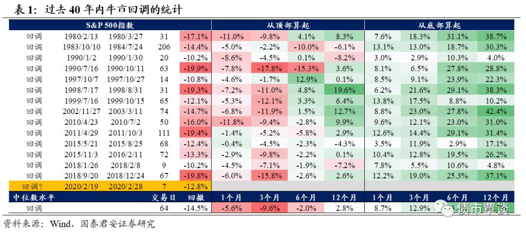 从1980年以来,过去40年内S&P 500指数一共发生了4次熊市,14次牛市回调和5次牛市。当前的牛市从2009年3月已持续11年,距离最近的牛市回调是2018年四季度(下跌19.8%)。