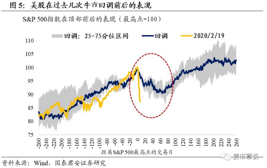 本次美股下跌比过去40年内的回调更剧烈。S&P 500在2月19日之前12个月的涨幅为21.8%,从2月19日到2月28日的7个交易日内已经下跌12.8%。历史上相似的牛市回调是2018年1月26日-2018年2月8日(9个交易日,下跌10.2%)和1997年10月7日-1997年10月27日(14个交易日,下跌10.8%)。