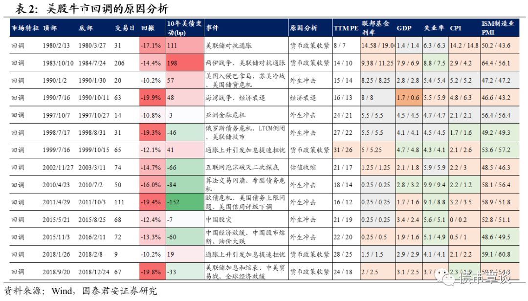 货币政策收紧:20世纪80年代初面对第二次石油危机,美联储不断加息对抗通胀,导致美股在1980-1984年出现了2次牛市回调(跌幅分别为-17.1%和-14.4%)。在互联网泡沫末期,1999年7月-10月出现-12.1%回调主要因为美联储加息,虽然当时估值也很高。2018年1月底美股在9个交易日下跌10.2%,触发原因是12月工资增速数据出现上升迹象,引发市场对美联储加快加息节奏的担忧。而2018年四季度美股出现的-19.8%回调,除了美联储持续缩表和加息预期,也叠加了贸易问题和全球经济放缓的原因。