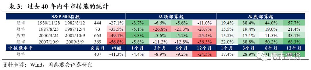 过去40年内S&P 500指数一共发生了4次熊市,分别为2007年10月-2009年3月的全球金融危机(跌幅-56.8%)、2000年3月-2002年10月的互联网泡沫破灭(-49.1%)、1987年8月-12月的“黑色星期一”股灾(-33.5%)和1980年11月-1982年8月美联储不断加息应对第二次石油危机和高通胀(-27.1%)。