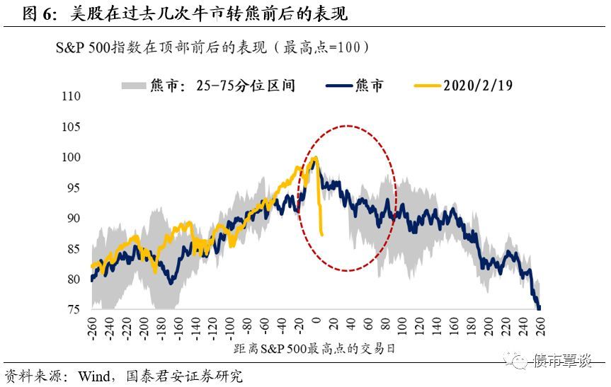 过去几次牛市转熊发生的前后,美股一般如何表现?S&P500由牛市转熊前的12个月内中位数涨幅为25.7%,高于牛市回调前的中位数涨幅19.7%。美股在转熊后一般持续下跌1.6年,不同于牛市回调后12个月内重新创新高,牛市转熊后12个月内下跌-24.5%。