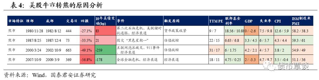 估值收缩:2000年3月-2002年10月互联网泡沫破灭,市盈率从31倍收缩到17倍,市场下跌-49.1%,而经济衰退在2001年3月才开始。在1987年8月-12月的“黑色星期一”股灾中市盈率从22倍收缩到15倍,市场下跌-33.5%。熊市前经济基本面都尚可,因而估值收缩是主要牛市转熊的原因。