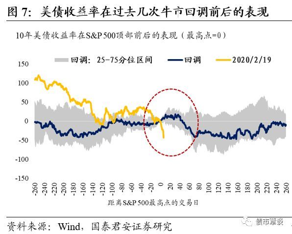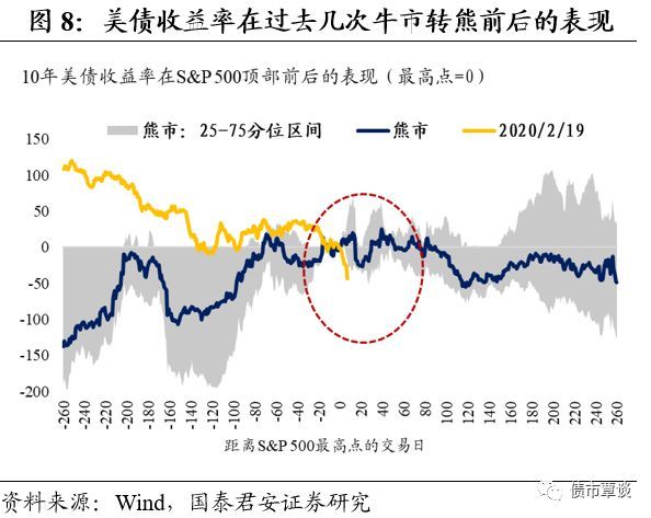 过去几次牛市回调和牛市转熊发生的前后,美债收益率一般如何表现?在牛市回调发生前的12个月美债收益率一般是区间震荡和微幅向上。在牛市转熊发生前的12个月美债收益率通常平均上行138bp,可能的解释是牛市后半段往往上涨幅度更大,投资者对风险资产的偏好、市场情绪和经济数据表现往往都会推升债券收益率上行(债券价格下跌)。无论是牛市回调,还是牛市转熊,在发生后的6个月内美债收益率一般会继续下行45bp左右。