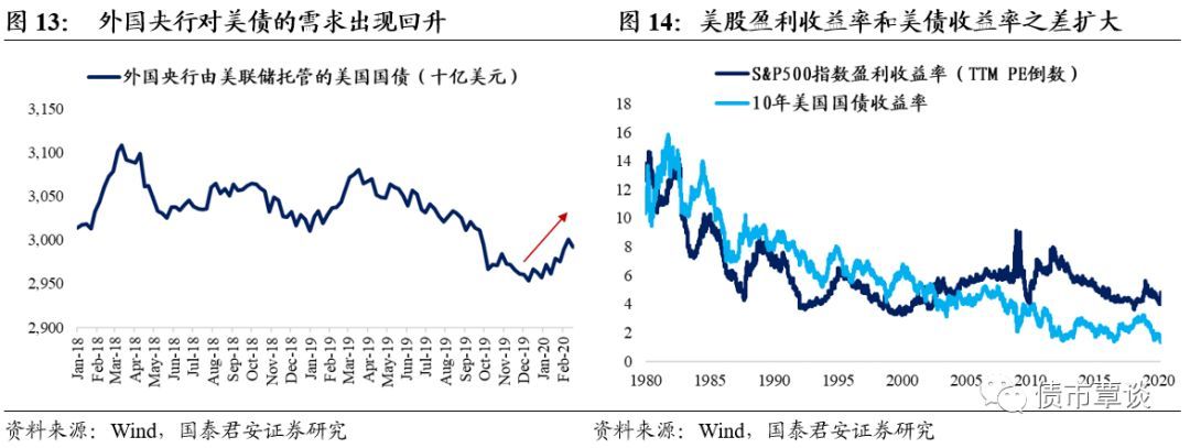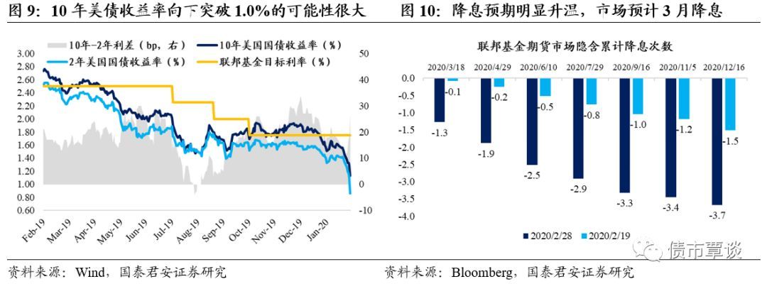 美债收益率后续走势如何看?短期看,海外新增确诊案例能否得到控制,尤其是美国本土的传播压力能否缓解,以及美联储是否会在3月FOMC会议降息和降息幅度,将会很大程度上影响美债和美股的走势。参考历次牛市回调的经验,短期内美股可能还会继续下行来完成情绪面和技术面的修复,10年美债收益率向下突破1.0%的可能性很大。市场预期的美联储3月降息(一次性降息50bp而非通常25bp的概率在上升),美国国债期货投机性头寸回补空头,美国商业银行和外国央行对美债的配置需求,以及3月3日民主党“超级星期二”都是美债收益率下行的利好因素。