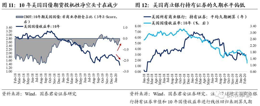从交易和配置的角度,10年美债收益率向下突破1.0%的可能性很大。期货投机性净持仓出现空头回补。作为国债主要配置力量的美国商业银行目前持有证券久期水平偏低,资产负债管理目标导致增加久期的需求上升,而外国央行对美债的需求也在出现回升。长期利率大幅下行的时候,美国商业银行由于为了维持负债端的存款而不会调整存款利率太多,而资产端由于住房抵押贷款在利率下行的时候,借款人对贷款进行再融资(Refinancing)的可能性会上升,同时商业银行持有的MBS证券也会面临同样情况,所以资产端的久期会在利率大幅下行的时候出现下降,因此为了资产负债久期,美国商业银行会购买国债或者MBS证券来增加久期。