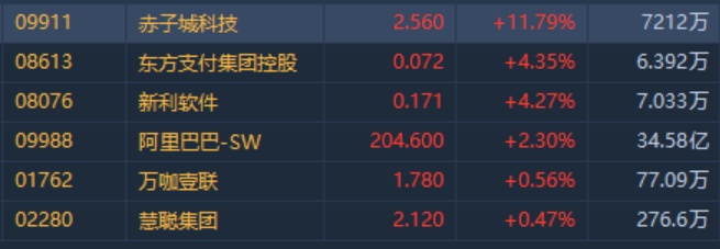 智通财经APP获悉,电商及互联网板块全线走高,赤子城科技(09911)领涨板块,截至收盘,赤子城科技涨11.79%,报价2.56港元,阿里巴巴(09988)涨2.3%,万咖壹联(01762)涨0.56%,慧聪集团(02280)涨0.47%。