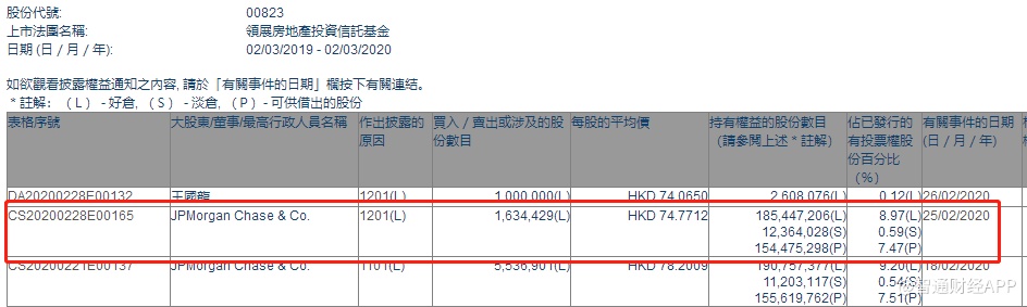 智通财经APP获悉,联交所最新资料显示,2月25日,摩根大通减持领展房产基金(00823)163.44万股,每股作价74.7712港元,涉及总金额约为1.22亿港元。减持后最新持股数目约为1.85亿股,最新持股比例8.97%。