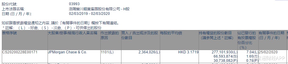 智通财经APP获悉,联交所最新资料显示,2月25日,摩根大通增持洛阳钼业(03993)236.4万股,每股作价3.1719港元,总金额约为750万港元。增持后最新持股数目约为2.77亿股,最新持股比例为7.04%。