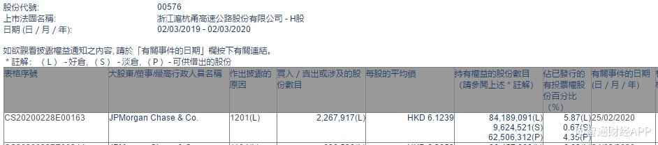 智通财经APP获悉,联交所最新资料显示,2月25日,摩根大通减持浙江沪杭甬(00576)226.79万股,每股作价6.1239港元,总金额约为1389万港元。减持后最新持股数目约为8418.90万股,最新持股比例为5.87%。