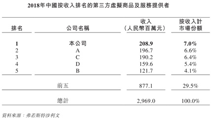 目前福禄控股在行业中,属于头部玩家。智通财经APP了解到,自公司成立起直至2019年9月30日,已经向超4亿名消费者销售了2万多种虚拟商品,截至2019年9月30日止十二个月,公司合共为600多家虚拟商品提供商以及1000多个消费场景促成交易,总GMV(成交额)为133亿元人民币(单位下同)。根据弗若斯特沙利文的资料显示,中国第三方虚拟商品及服务市场规模2014-2018年保持着14.4%的年均复合增长态势,未来5年仍能9.4%的年均复合增长驴。目前整个市场集中还是比较高的,2018年中国第三方虚拟商品及服务行业十大参与者GMV占总比能达到57.9%,其中福禄控股以3.4%的市场份额排在第六,如果按收入规模算的话,公司则是以7%的市占率位列行业第一。