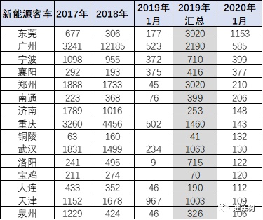 2020年1月的东莞、北京、苏州、深圳、郑州等北方省会城市的的客车表现较好。部分城市19年销量超越18年全年。