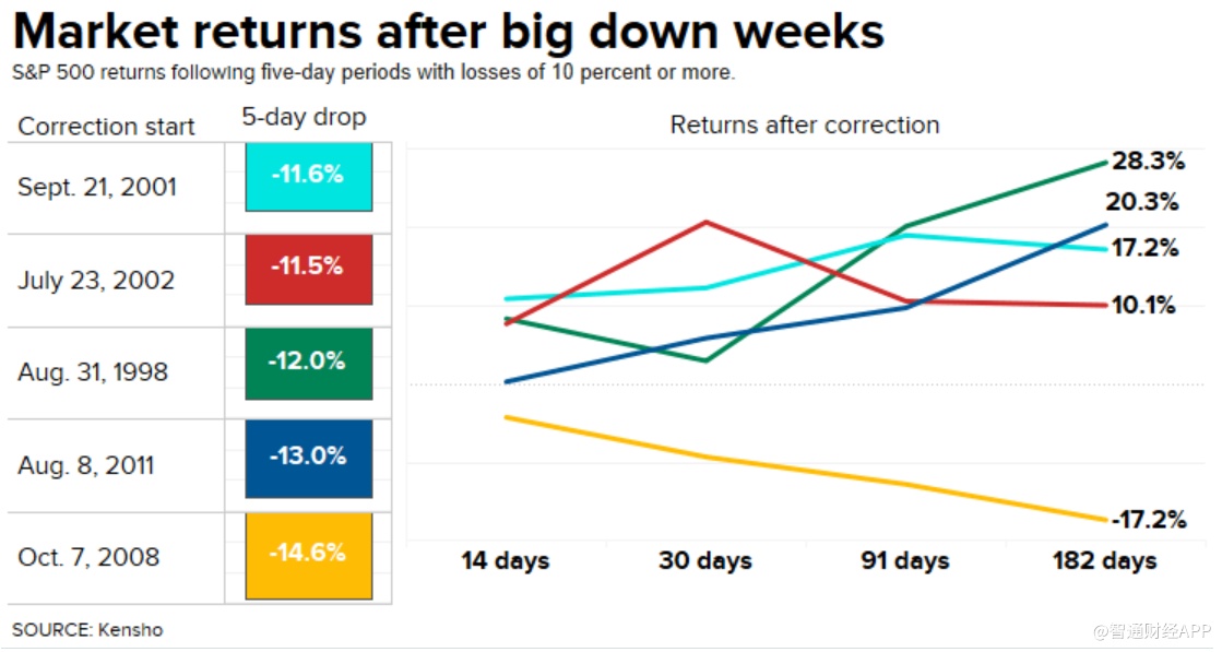 智通财经APP获悉,周一,分析师通过研究对冲基金工具Kensho提供的数据得出,美股市场在五个交易日中跌幅达到10%或以上时,股市在随后的几周内倾向于反弹。