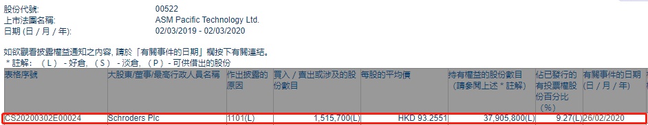 智通财经APP获悉,联交所最新资料显示,2月26日,Schroders Plc增持ASM太平洋(00522)151.57万股,每股作价93.2551港元,涉及总金额约为1.41亿港元。增持后最新持股数目约为3790.58万股,最新持股比例9.27%。