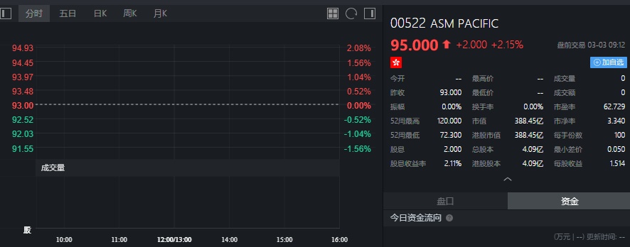 今日盘前交易时段,截至发稿,ASM太平洋涨2.15%,报95港元。