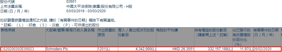 智通财经APP获悉,根据联交所资料显示,2月26日,Schroders Plc减持中国太保(02601)434.2万股,每股作价26.3551港元,总值约1.14亿港元。减持后最新持股数目约3.32亿股,最新持股比例为11.97%。