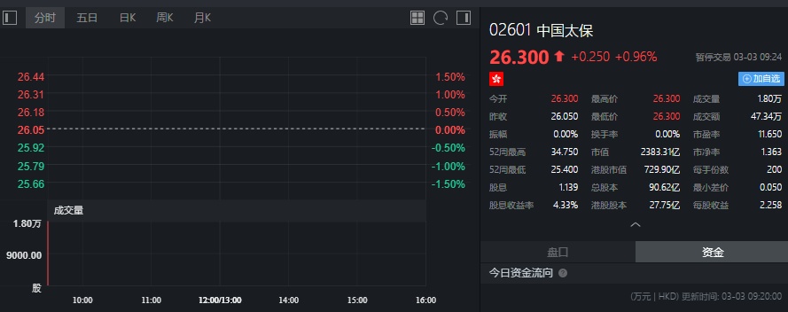 今日盘前交易时段,截至发稿,中国太保涨0.96%,报26.30港元。