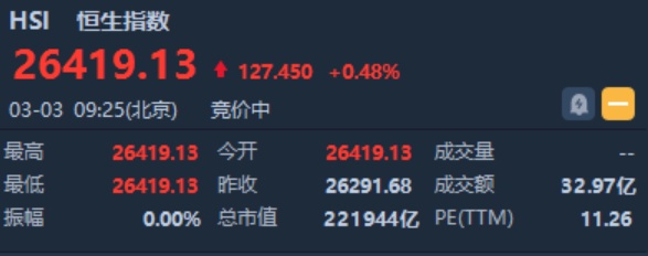 智通财经APP获悉,恒生指数开盘涨127.45点或0.48%,报26419.13点。国企指数涨0.41%,报10527.97点。红筹指数涨0.6%,报4134.61点。大市盘前成交32.97亿港元。