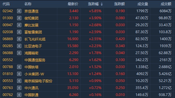 智通财经APP获悉,5G概念股早盘再受资金追捧,多股创下阶段性新高。截至发稿,京信通信(02342)涨5.54%,报3.43港元;俊知集团(01300)涨5.36%,报2.16港元;长飞光纤电缆(06869)涨1.82%,报16.78港元;中国铁塔(00788)涨1.01%,报2港元。