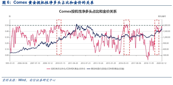 上述四种解释中看似都有道理,但也都有各自的问题。其中第二种解释即持仓占比,在极值处确实具有提示效果和参考价值,但持仓多寡背后的逻辑仍是未知,净多头持仓和金价高度同步,有相关性,甚至可能互为因果,很难据此为金价持续提供较为准确的预测。