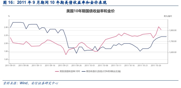 2011年9月22日的案例颇具代表性。理论上,长端利率本身就对流动性的变化反应较为钝化,且在联储发布重要表态时,长债收益率的反应也需要过程。以上8次案例中有5次发生在金融危机阶段,主要是关于流动性危机的故事。2011年9月22日的例子值得重视,当时联储公布扭转操作,大幅低于市场预期,金价大跌,10年期国债收益却先迅速下跌,随后一段时间才逐步上行,一个可能的原因是联储这种鹰派的表态往往会冲击到股票市场,因为跷跷板效应在传递到债市,带来债券收益率的下行,随后才逐步反映鹰派预期,美债收益率上行,但此时黄金并没有进一步下跌。