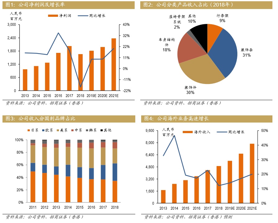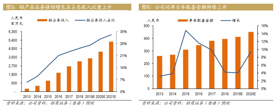 今年汽车产业链整体下行压力加大。截止2月底,公司除武汉工厂外均已全部复工,估计大部分工厂复工率在八成以上。武汉工厂约占公司收入10%,假设当地持续半年并考虑上下半年淡旺季差异,估计影响公司全年收入3-4%。海外业务占公司收入约44%,预计保持稳健增长。轻量化业务方面,除前述电池盒业务外,公司铝门框今年开始大规模配套日系燃油车,成为业绩重要驱动力。当前公司铝业务全球市占率约17%,预计2025年提升至33%。