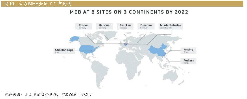 大众计划2022年前在全球范围内建成8间MEB纯电汽车工厂,其中德国4座,捷克1座,中国2座(安亭/佛山),美国1座。
