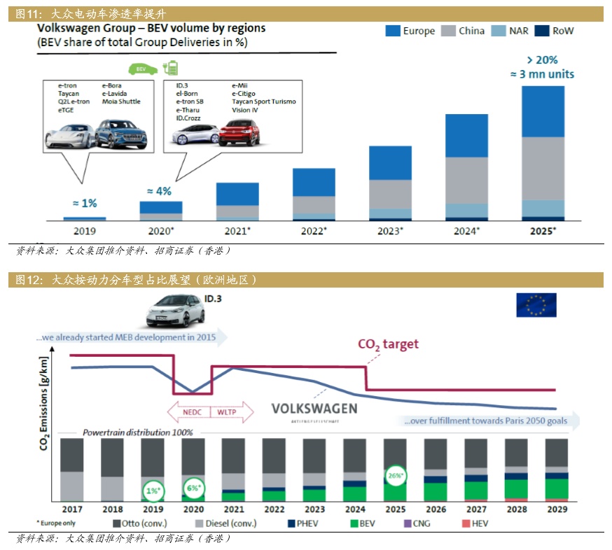 大众电动车销量占比预计从2019年的1%提高到2020年的4%,2025年提高到20-25%。