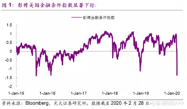 对美联储而言,当前主要面对两个问题:一是资产价格调整带来的短期的金融冲击。过去一周股市和商品恐慌式下跌,连避险资产黄金都不能幸免,反映出市场流动性在趋紧。一个可观测的指标是美国金融条件指数,截至2月28日,彭博美国金融条件指数已显著下行(下行代表收紧)(图1)。