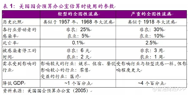 情形二:美国发生轻型的突发事件,传播参数类似于1957年、1968年大流感。基于美国国会预算办公室(CBO)的估算,这一程度的流感或降低美国GDP约1个百分点,对应2020年GDP增速1%。表1总结了CBO估算的相关参数[1]。