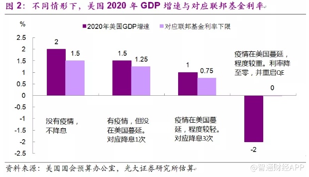 第一种情形下,美联储或降息1次,对应联邦基金利率下限为1.25%;第二种情形下,美联储或降息3次,对应联邦基金利率下限为0.75%;第三种情形下,美联储或将利率下限降至零,同时不排除重启量化宽松(图2)。
