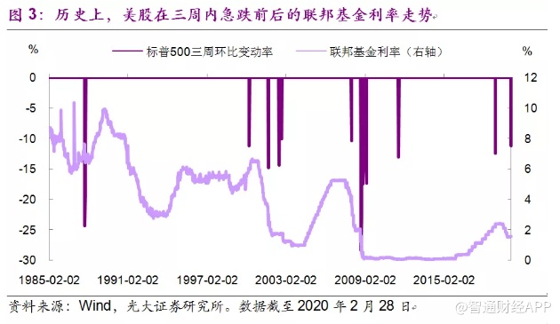 从历史规律来看,美股急速下跌后美联储大都会降息,不过次贷危机后也有例外。我们考察了1985年以来美股在三周内急跌10%以上的情形,包括1987年美股“黑色星期一”、2000年互联网泡沫破灭、2008年次贷危机、2012年欧债危机、2018年底美股大跌、以及此次大跌(图3)。
