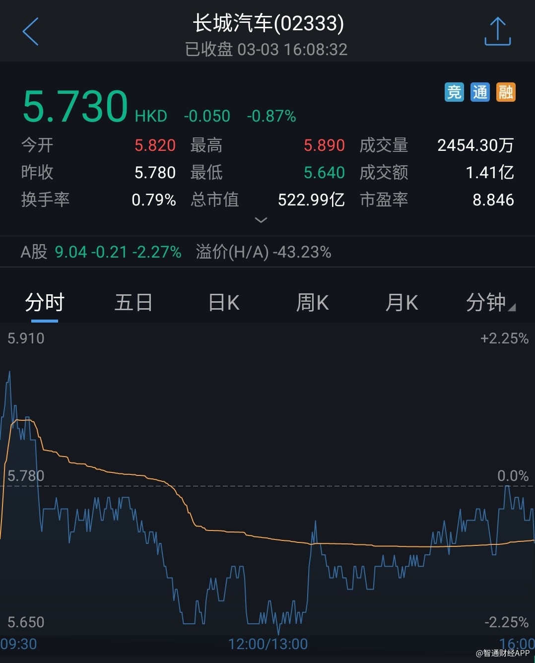 截至发稿,长城汽车跌0.87%,报5.73港元。