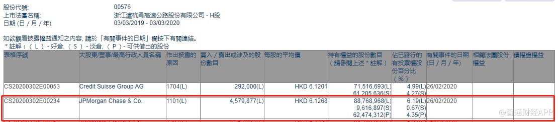 智通财经APP获悉,联交所最新资料显示,2月26日,摩根大通增持浙江沪杭甬(00576)约457.99万股,每股作价6.1268港元,涉及总金额约为2806.01万港元。增持后最新持股数目约为8876.90亿股,最新持股比例6.19%。