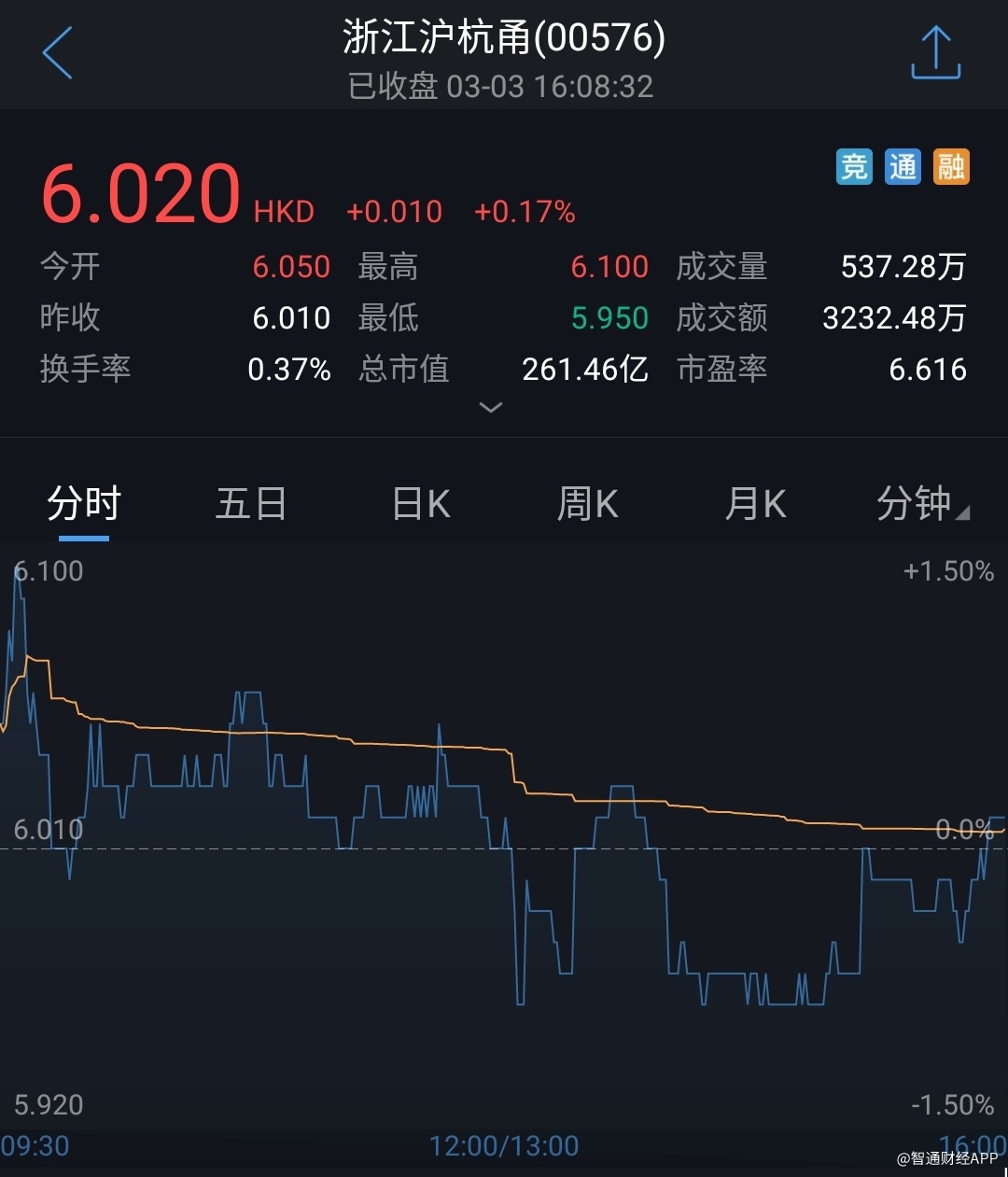 截至发稿,浙江沪杭甬涨0.17%,报6.02港元。