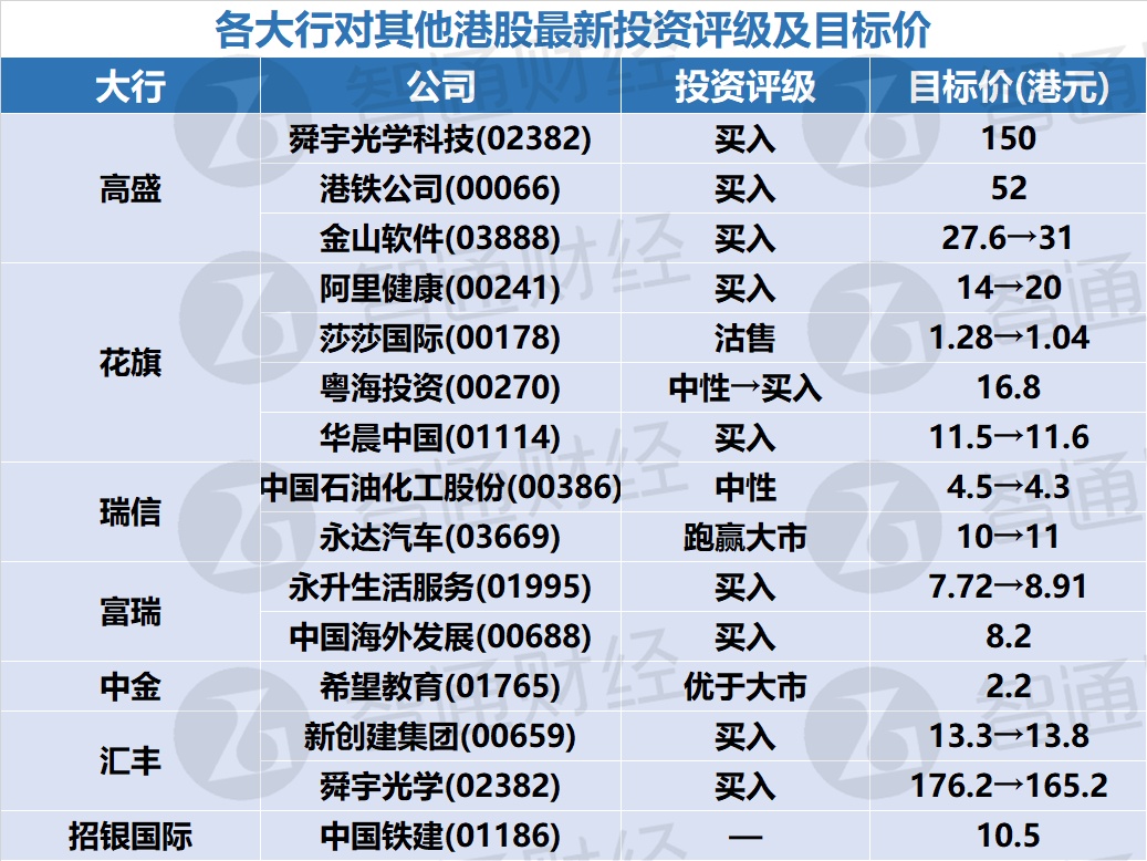 三、各大行对其他港股最新投资评级及目标价
