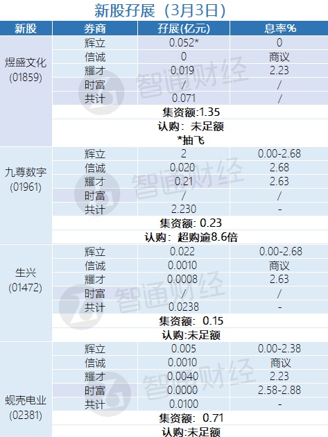 智通财经APP获悉,3月3日,煜盛文化(01859)、九尊数字(01961)、生兴(01472)、奇士达(06918)、常达(01433)、烨星(01941)、蚬壳电业(02381)正在招股中。