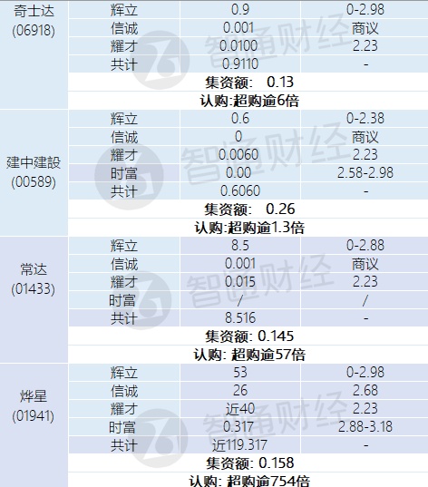 其中、九尊数字超购逾8.6倍、奇士达超购逾6倍、常达超购逾57倍、烨星超购逾754倍。煜盛文化、生兴、蚬壳电业认购未足额。