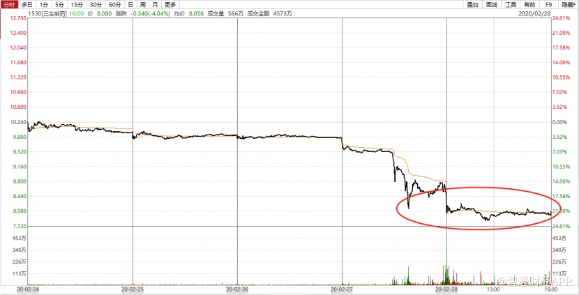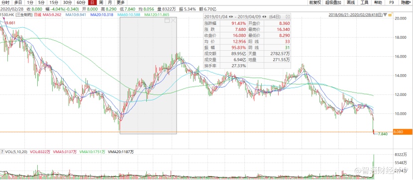 覆巢之下,岂有完卵,在这种系统性的大跌面前,除了部分疫情受益概念股之外,大部分的公司都是泥沙俱下,历史就是这么有趣,在系统性风险的冲击下,三生制药(01530)又来到了2019年初的一模一样的场景:
