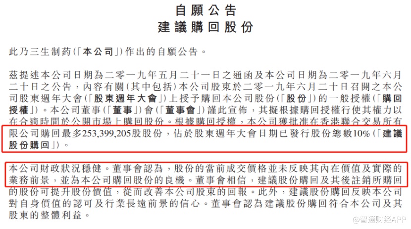 2018年下半年,从《药神》到疫苗之王,持续冲击医药股估值,最终在年底的4+7带量采购把整个行业的情绪打到谷底,行业性的持续大跌,三生的核心品种都是生物药,本不受政策影响,但是也走不了独立行情,跟随行业大跌,随后,公司在2018年12月19日-2019年1月3日的低位区间,持续回购(上市以来首次),累计回购8233.43万,均价8.46元/股,随着利空情绪的消退和业绩的确认,股价走出一波估值修复行情,区间最大涨幅超过90%,由此可见:1)管理层关注公众股东价值和感受;2)管理层对于时机的把握很讲究。
