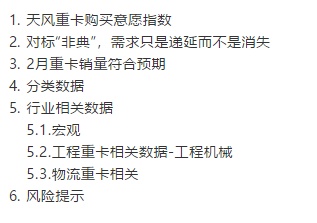 看好以后的销量反弹,继续看好重卡发动机龙头【潍柴动力(02338)】、治理改善的【中国重汽(03808)】、高股息低估值的【威孚高科】,建议关注【中国重汽A】。