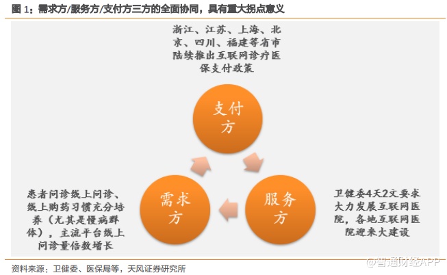 回顾2013-2016年,互联网医疗的大发展仅仅从服务方推动,政策端驱动和第三方平台的兴起,但患者教育缓慢,且支付方没有入场,整个行业发展的并不美丽(随后政策还收紧)。这一次行业的大发展是一次真正的变革,原因在于:这一次是需求方、服务方和支付方三者协同,通力推进。