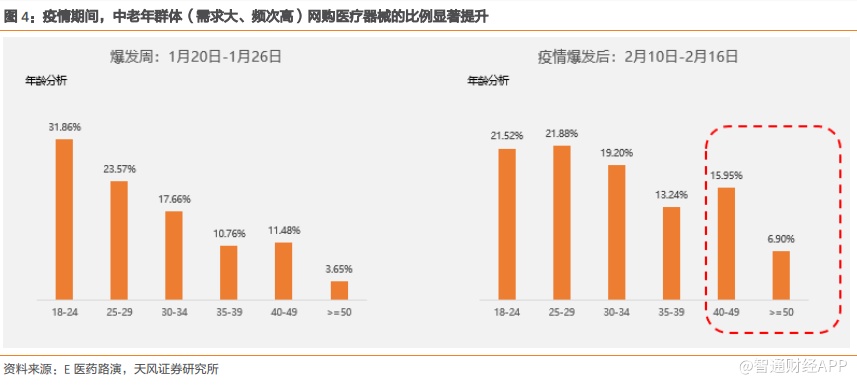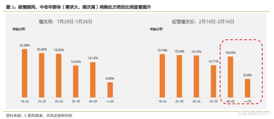 此外,根据阿里健康数据,春节期间,中老年通过网络购买药品/医疗器械/保健品的比例提升明显。这一部分人群的潜在需求量最大、频次最高,快速复诊/网络续方/便捷购药的习惯一旦养成,往往是不可逆的,后续留存率有望维持高位(破除低频消费、留存率低的魔咒)。