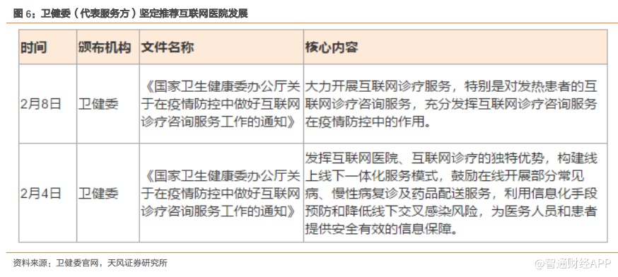 其次,从服务方来看,卫健委(代表了医院)2月4日-2月8日连续发布两份政策文件,鼓励互联网医疗行业发展。以前,政策对互联网医院、互联网诊疗的态度较为谨慎,措辞上以“规范发展”为主。2 月8日政策中,卫健委明确提出要“大力”发展互联网医疗,这代表了服务方的态度——从谨慎推动到鼓励大力发展的重大转变。从落地来看,全国各地互联网医院建设非常火爆,各地加急上马。